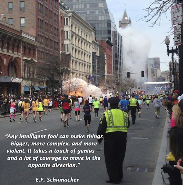 Gallery Foolish Violence! 16 Tuesday Apr 2013 Posted by Miki in My Thoughts ≈ Leave a comment TagsBomb, Bombing, Boston, Boston Marathon 2013, Courage, E.F. Schumacher, Introspection, Marathon, Quote, Terrorism, Terrorist, Tragedy, Violence WonderWomanTalks.com reaches out to all the victims and families affected by the bombings during the 2013 Boston Marathon. May you find the strength and courage to overcome this horrific tragedy. -Miki Share this: Click to email a link to a friend (Opens in new window) Email Click to share on Facebook (Opens in new window) Facebook Click to share on X (Opens in new window) X Like Loading... Related